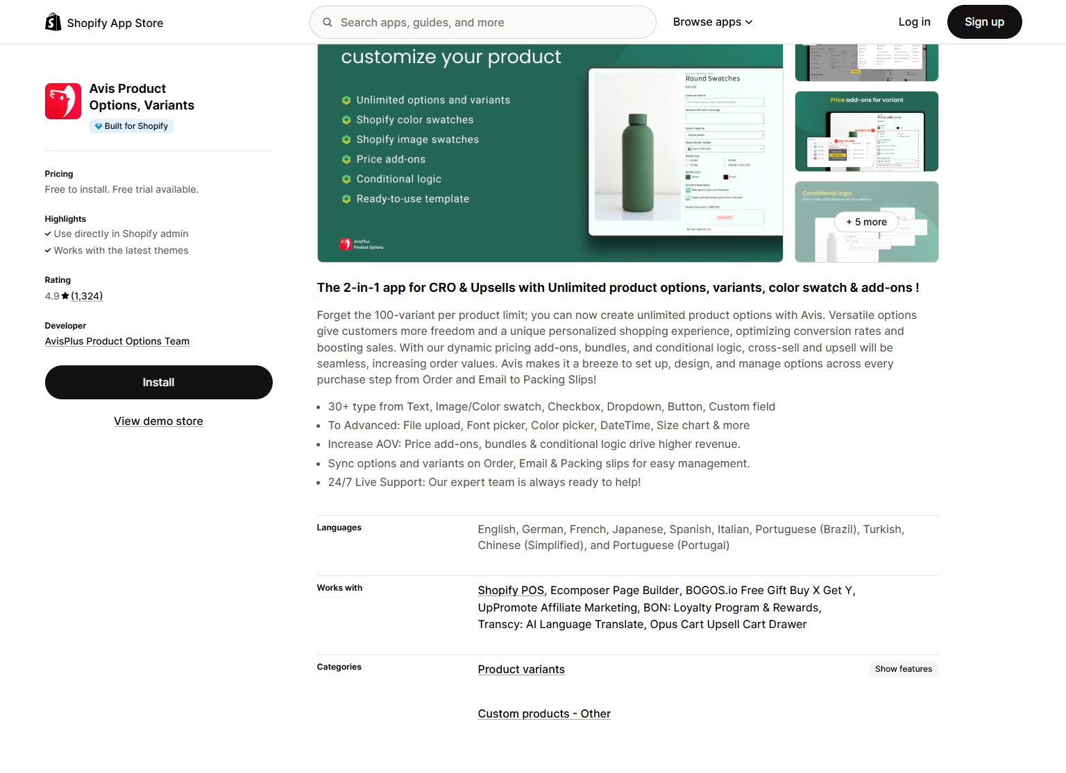 Avis Product Options is a comprehensive solution that offers a vast range of option types and dynamic pricing to maximize order value. It is an excellent all-around choice for merchants who need advanced features backed by reliable, around-the-clock support.
