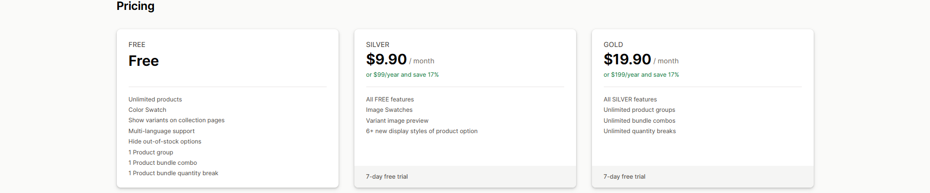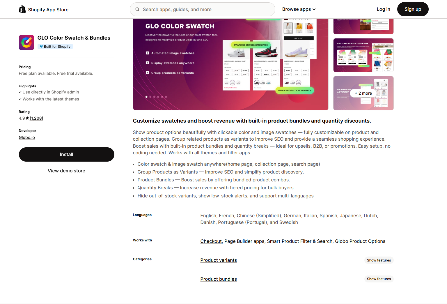 GLO Color Swatch & Bundles | Improving visual presentation with swatches and bundles. | $9.90/month | Yes | 4.9/5 |