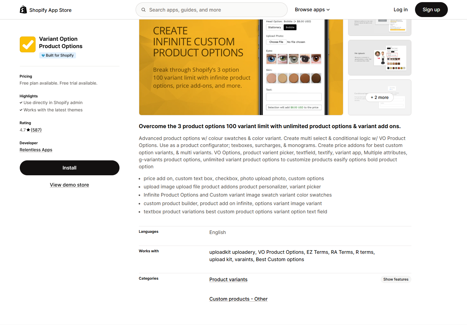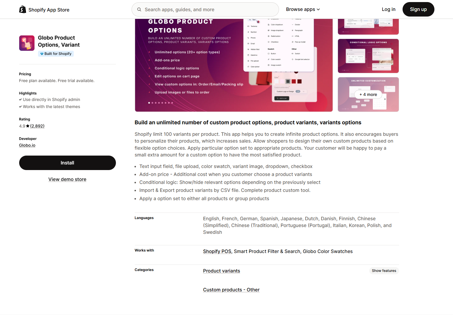 Globo Product Options, Variant | Stores needing unlimited variants and conditional logic. | $12.90/month | Yes | 4.9/5 |