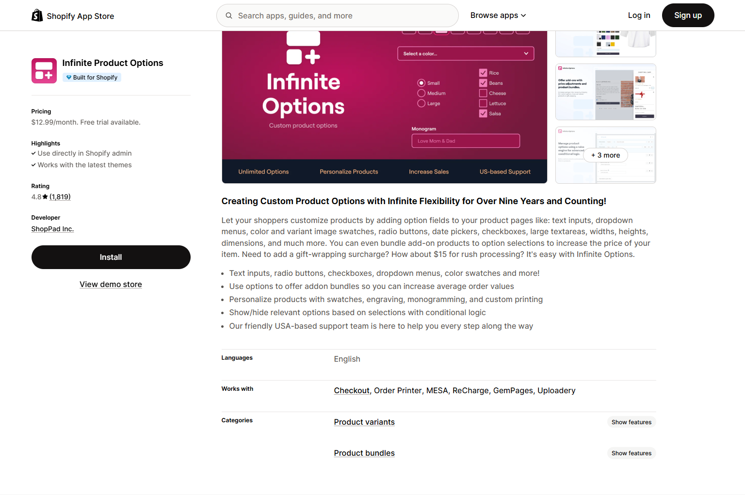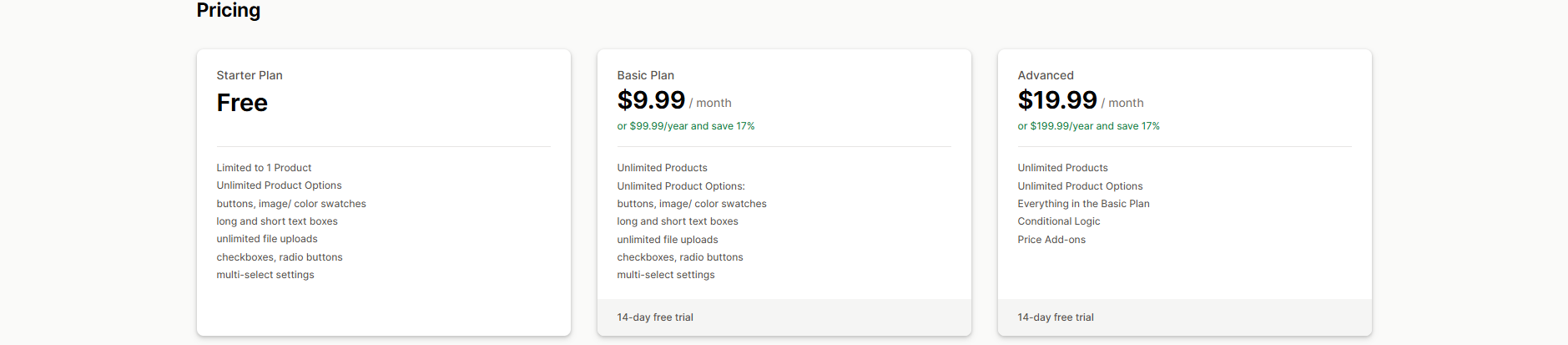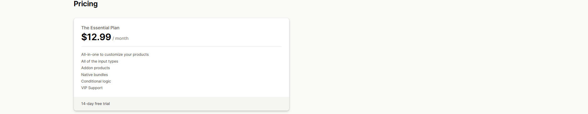 Infinite Product Options | Bundling add-ons and charging for extra services. | $12.99/month | No | 4.8/5 |