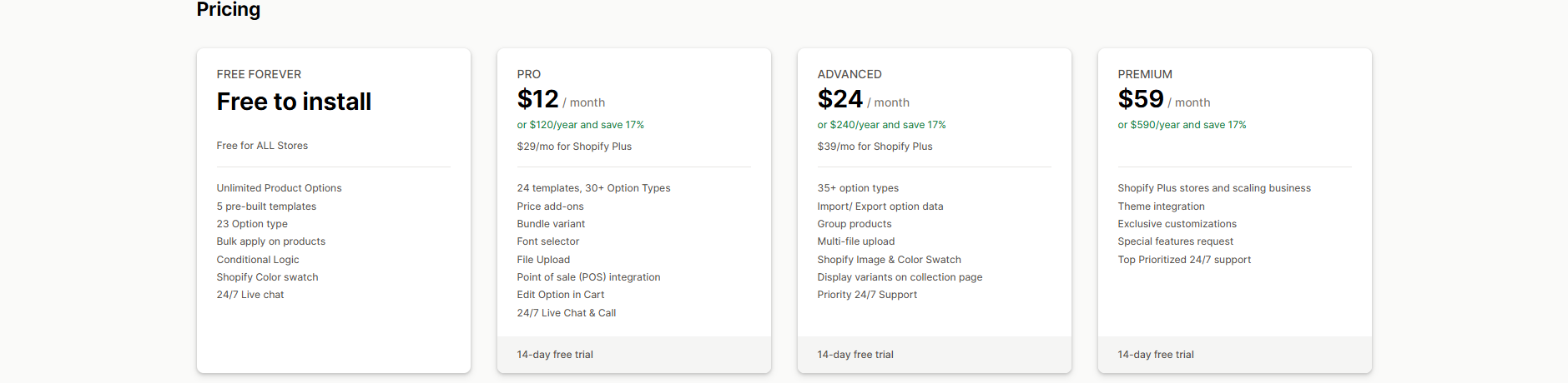 Avis Product Options, Variants | Advanced option types and upselling with 24/7 support. | $12/month | Yes | 4.9/5 |