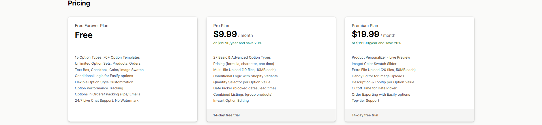 Easify Custom Product Options | Live preview personalizers for real-time customization. | $9.99/month | Yes | 4.9/5 |