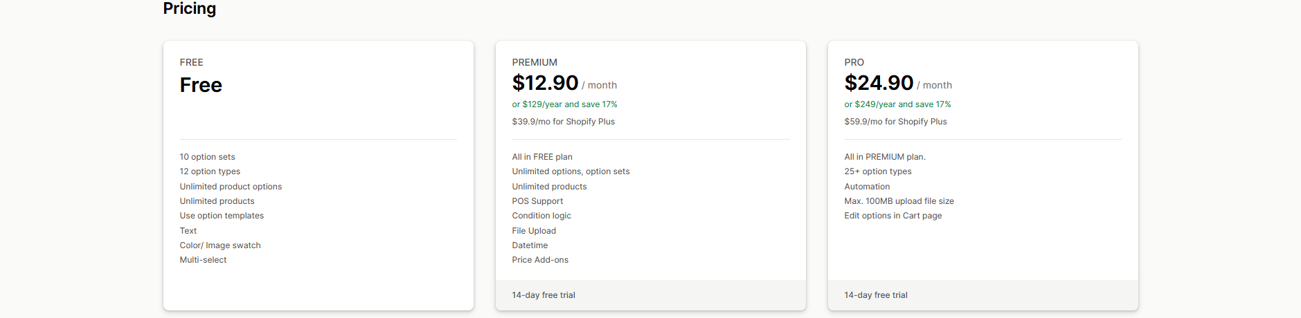 Pricing: A free plan is available with 10 option sets. Paid plans start at $12.90/month, with a 17% discount for yearly billing.