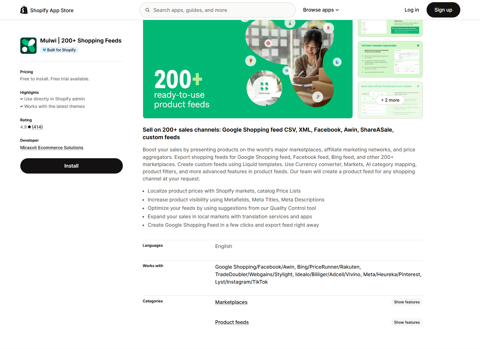 Mulwi | 200+ Shopping Feeds | Broad platform support (200+ channels) | $15/month | Yes | 4.9/5 |