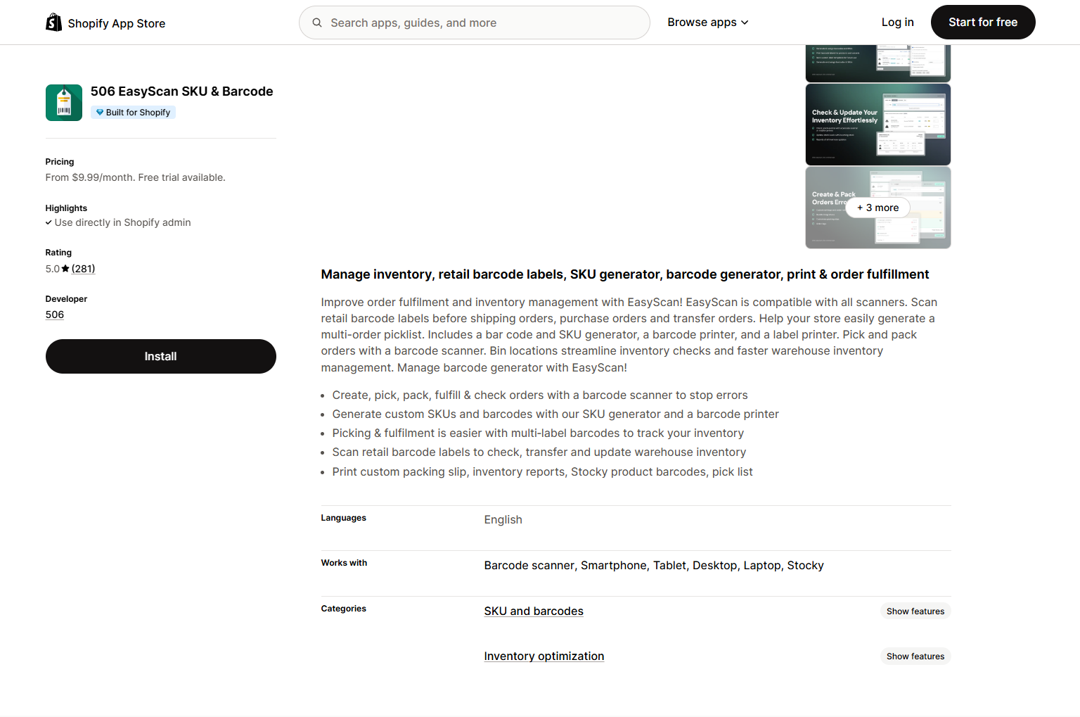 506 EasyScan SKU & Barcode | Full inventory and order management | $9.99/month | No | 5.0 |