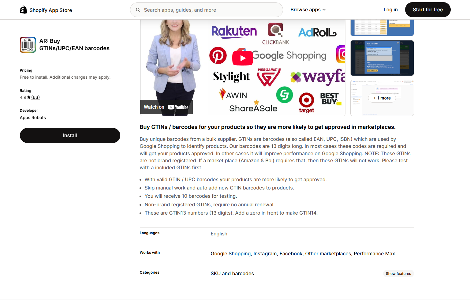 AR: Buy GTINs/UPC/EAN barcodes | Sourcing GTINs for Google Shopping | Free to install | Yes | 4.9 |