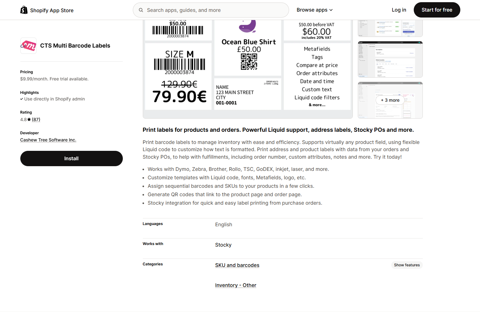 CTS Multi Barcode Labels | Advanced customization with Liquid | $9.99/month | No | 4.8 |