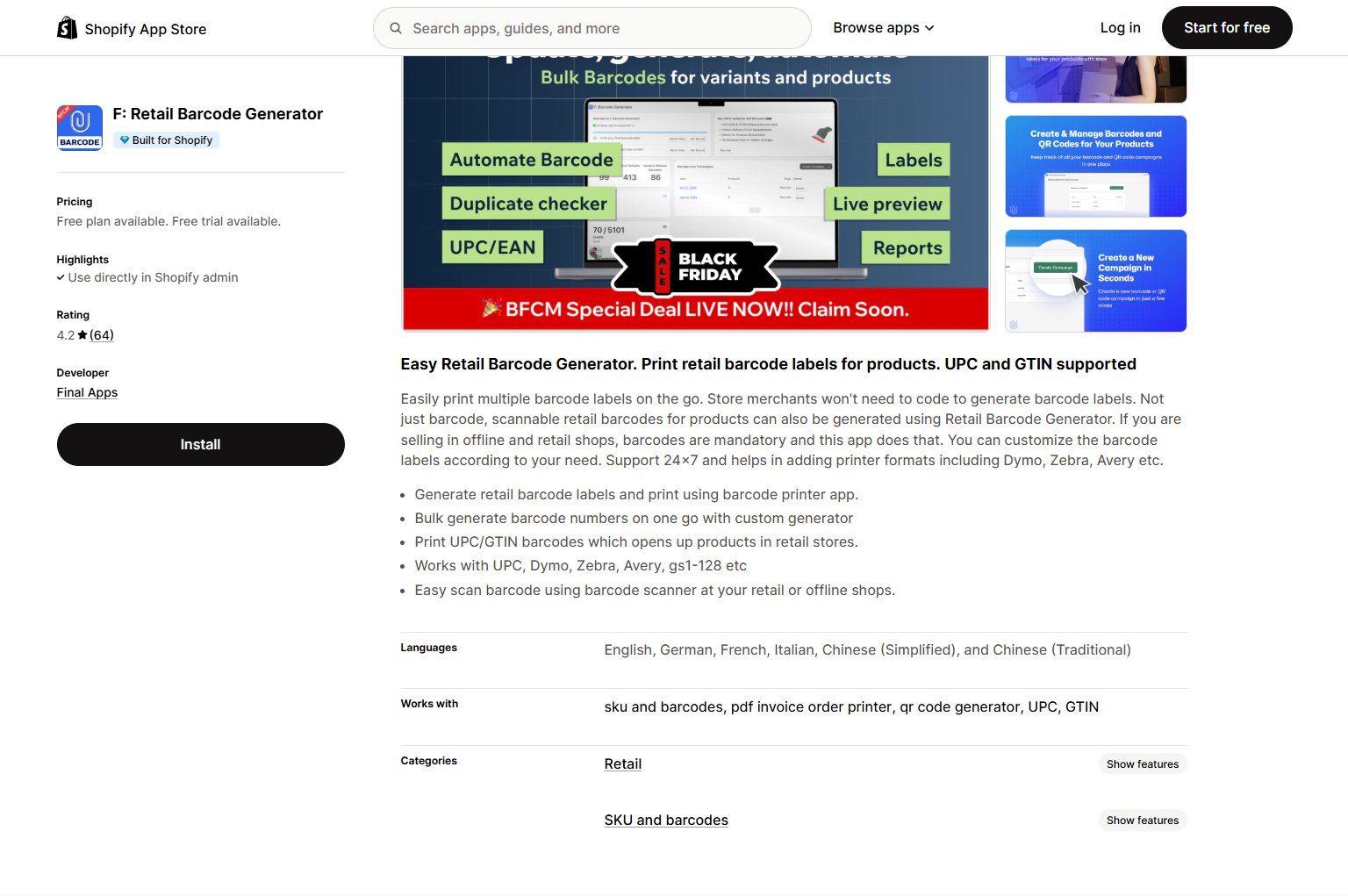 F: Retail Barcode Generator | Bulk barcode generation | $5.00/month | Yes | 4.1 |