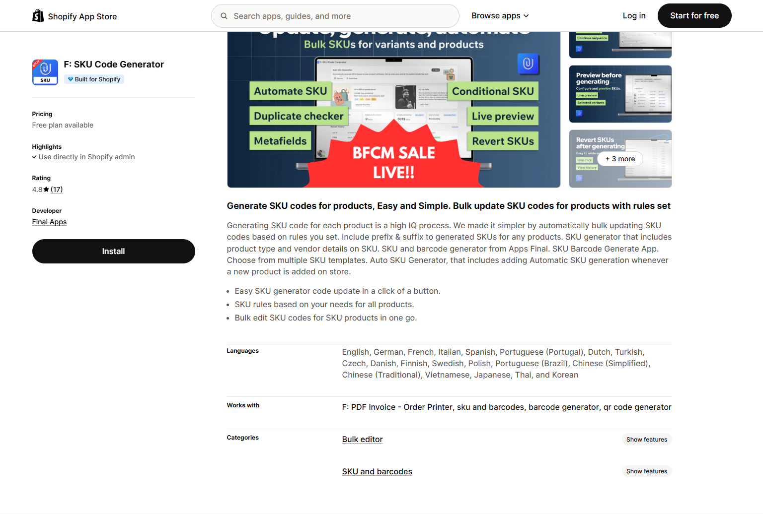 As its name suggests, this app is dedicated to simplifying SKU management. It automates the creation of unique, logical SKUs based on rules you define, ensuring consistency across your product catalog.