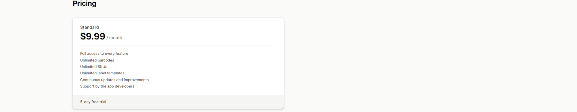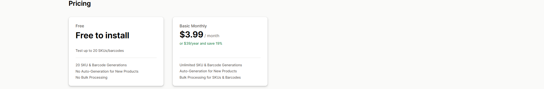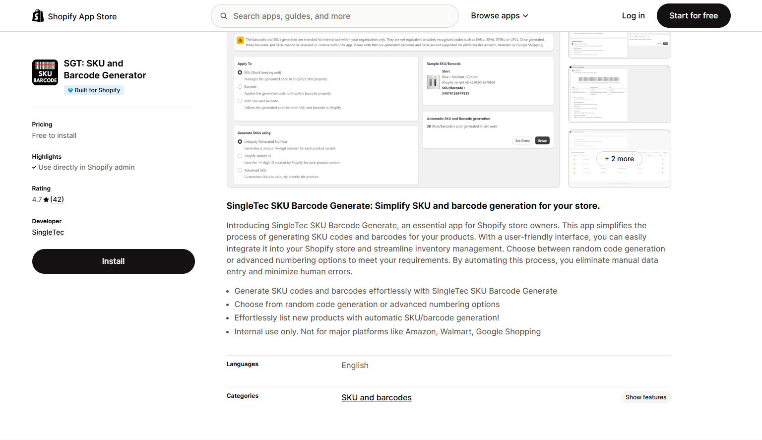 SGT: SKU and Barcode Generator | Simple SKU and barcode auto-generation | $3.99/month | No (Free to install) | 4.9 |