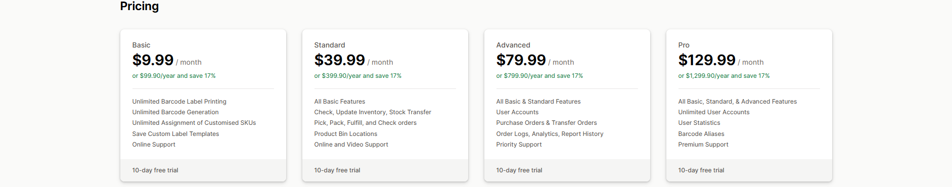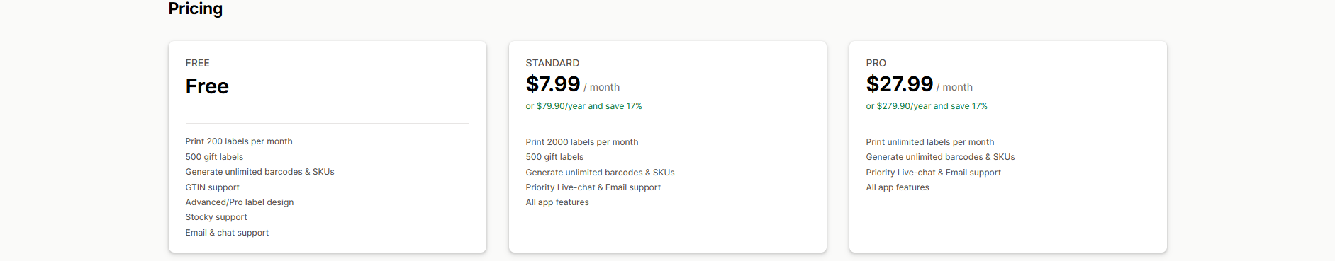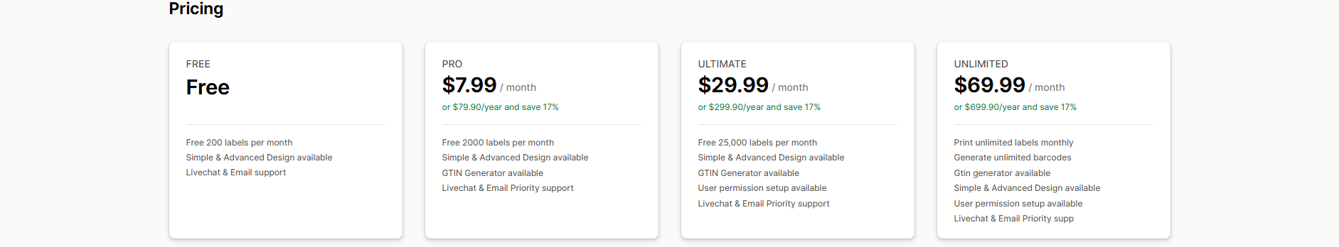 Pricing: A free plan is available for Print 200 labels per month. Paid plans start at $7.99/month, with a 17% discount for annual billing.