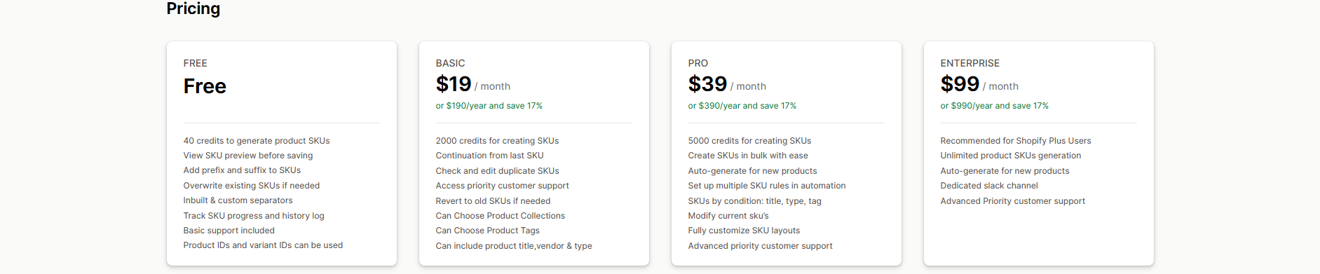 F: SKU Code Generator | Automated SKU rule-based generation | $19/month | Yes | 4.8 |