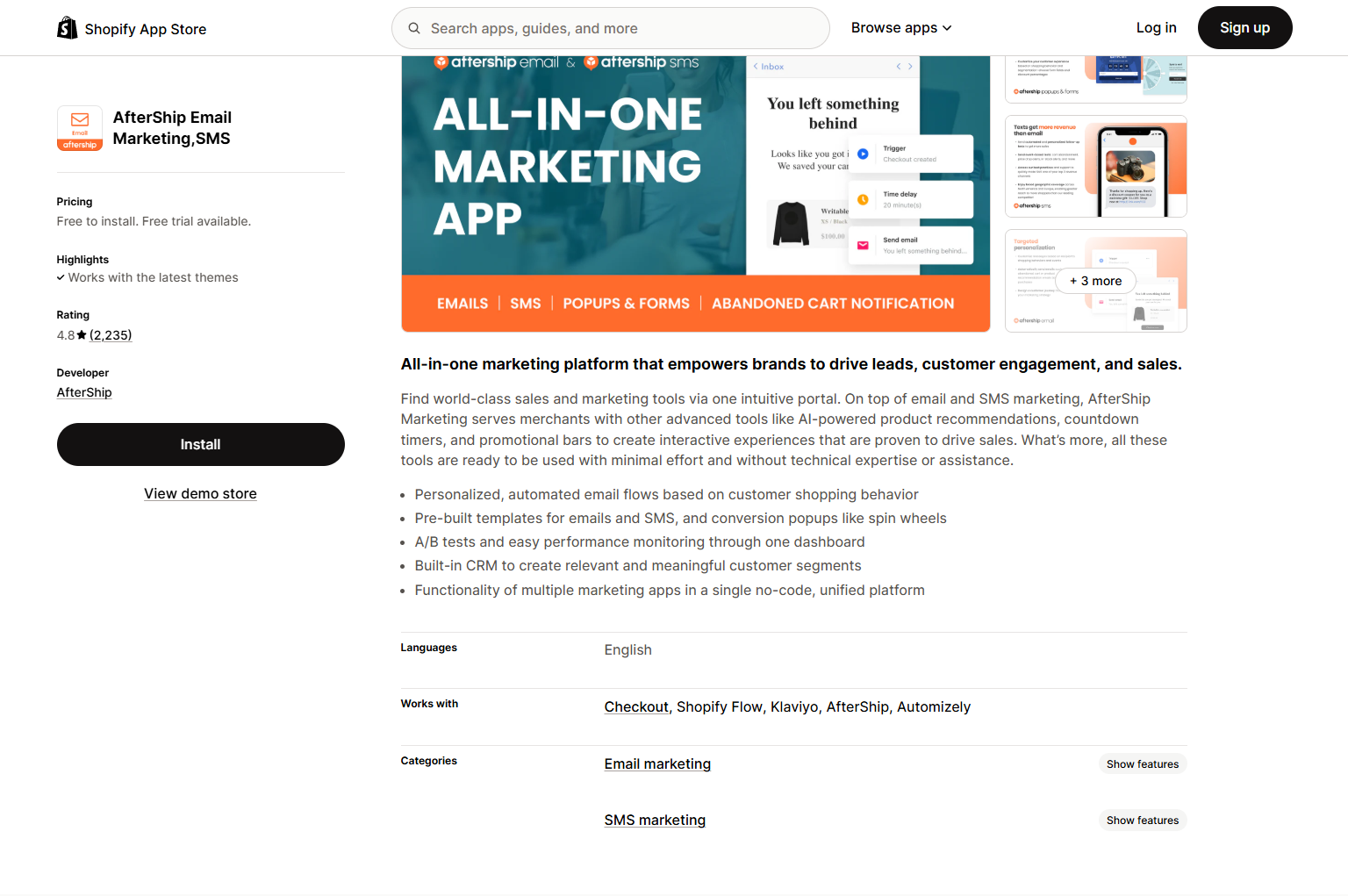 AfterShip Email Marketing,SMS | Integrated marketing with a built-in CRM | $11/month | Yes | 4.8/5 |