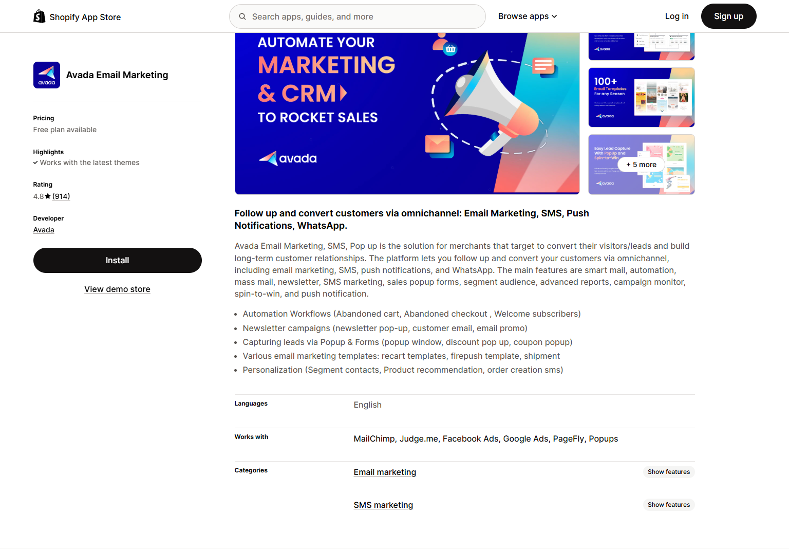 - Core Features: Does the app cover the essentials you need? Look for features like campaign automation, abandoned cart recovery, customer segmentation, and performance analytics. Some apps, like Klaviyo and Avada, also offer email and WhatsApp, providing an omnichannel solution.