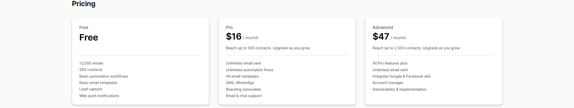 Pricing: A Free plan is available. Paid plans start from $15/month and $20/month tiers, depending on your contact list size and sending volume.