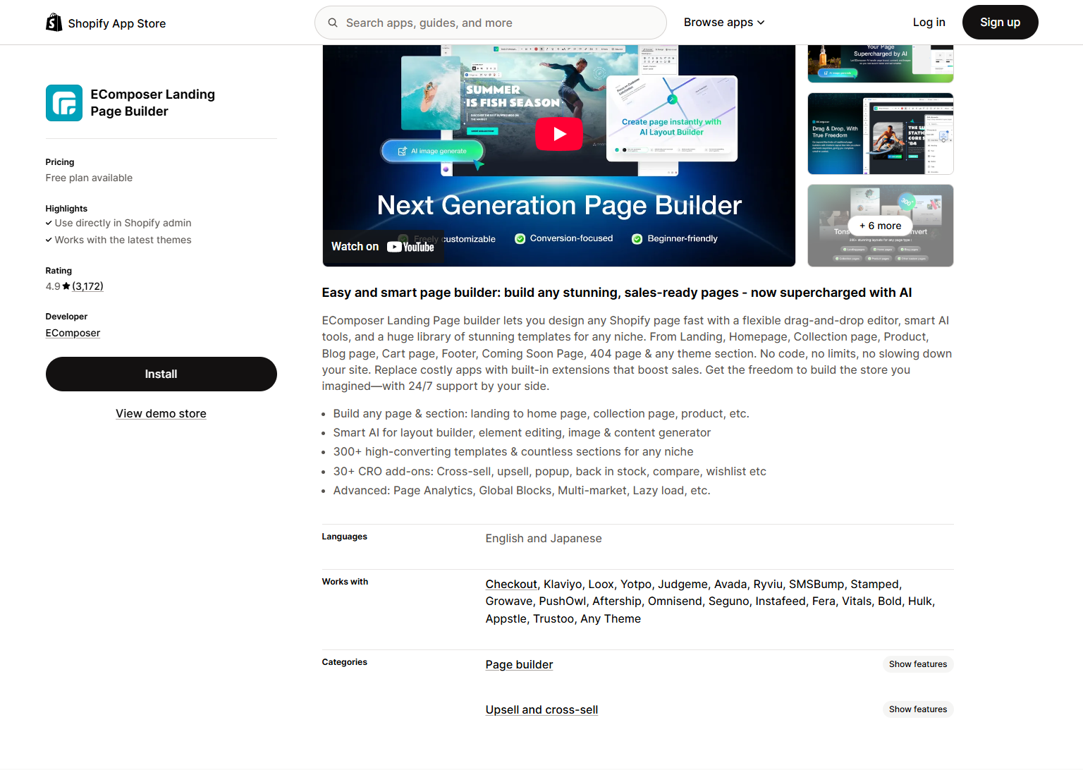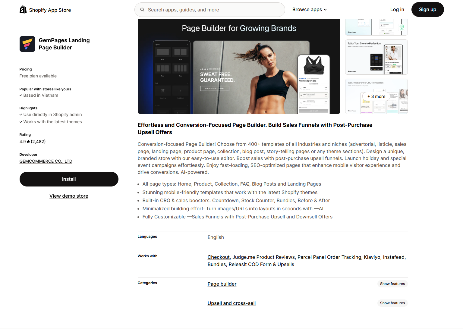 GemPages emphasizes conversion-first templates. It provides pre-built layouts, SEO optimization, upsell features, and video backgrounds. Easy for beginners, robust for pros.