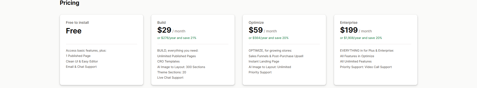 - Template variety. While solid for simple needs, advanced page design options are fewer than PageFly or GemPages.