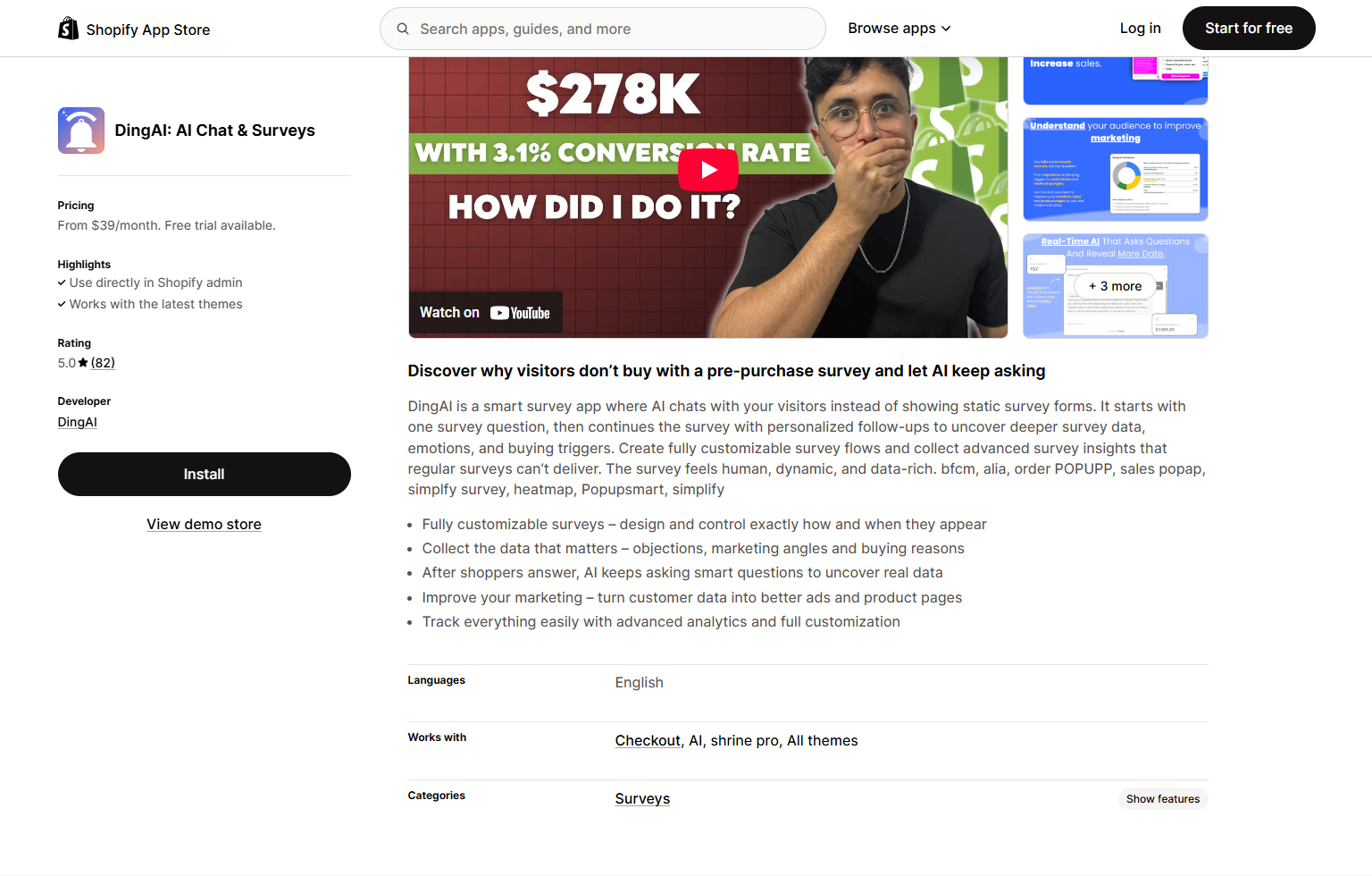 DingAI: AI Chat & Surveys | Using AI to identify customer concerns in real-time. | $39 | No | 5.0 |