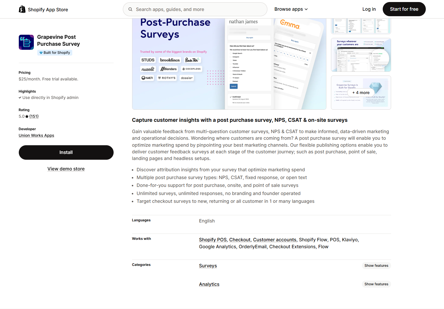 Grapevine Post Purchase Survey | Targeted post-purchase and onsite surveys. | $25/month | No | 5.0 |