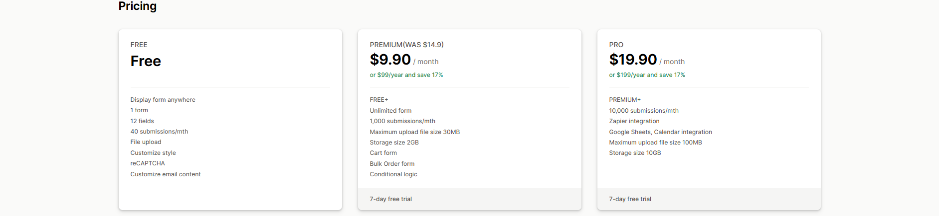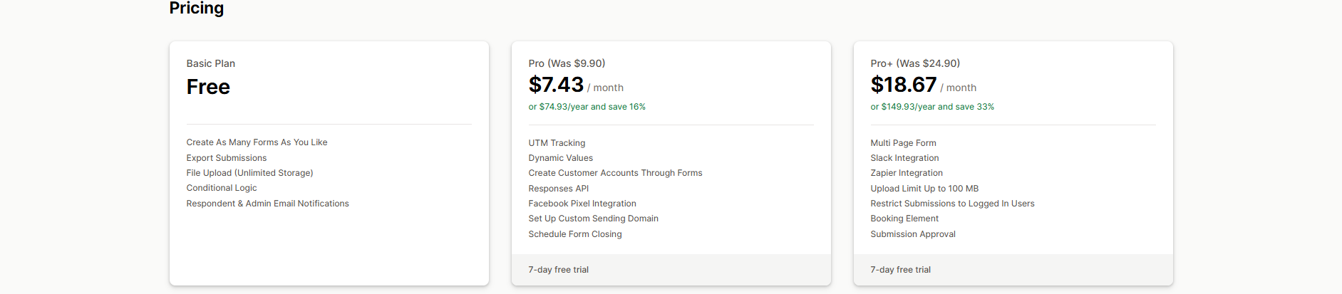 Pricing: A free plan is available for 2 Forms, 50 Submissions/month. Paid plans start at $4.49/month.