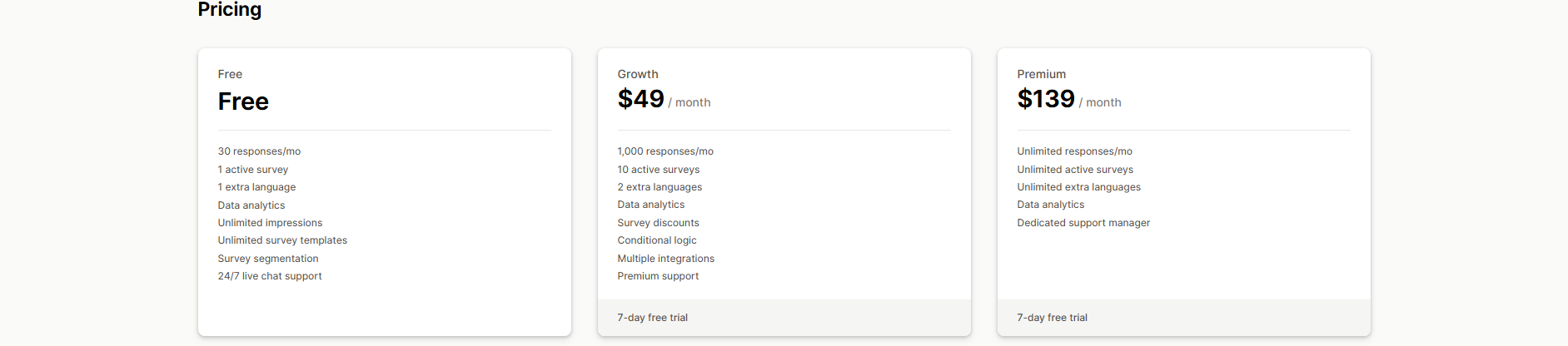 Pricing: Free for 30 responses/month. Paid plans start at $49/month.