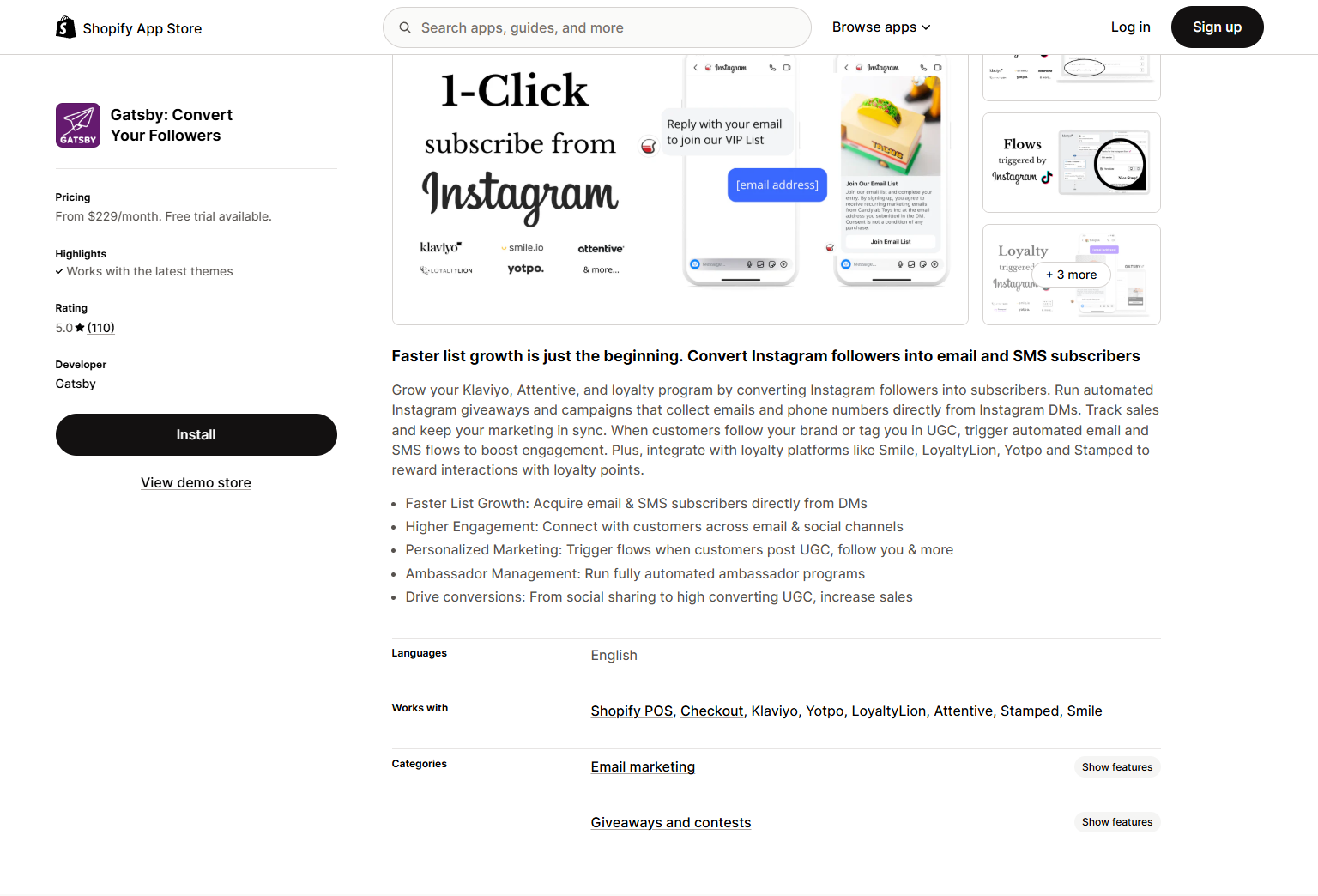 Gatsby specializes in converting Instagram followers into subscribers and customers through automated DM campaigns and giveaways. It personalizes marketing by triggering flows for specific social actions.