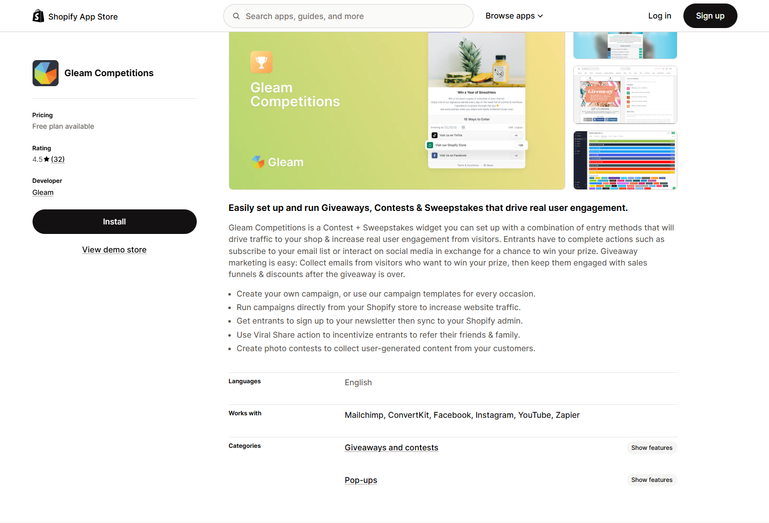 Gleam Competitions helps businesses drive website traffic and user engagement through contests. It focuses on rewarding visitors for completing actions like email subscriptions or social media interactions.