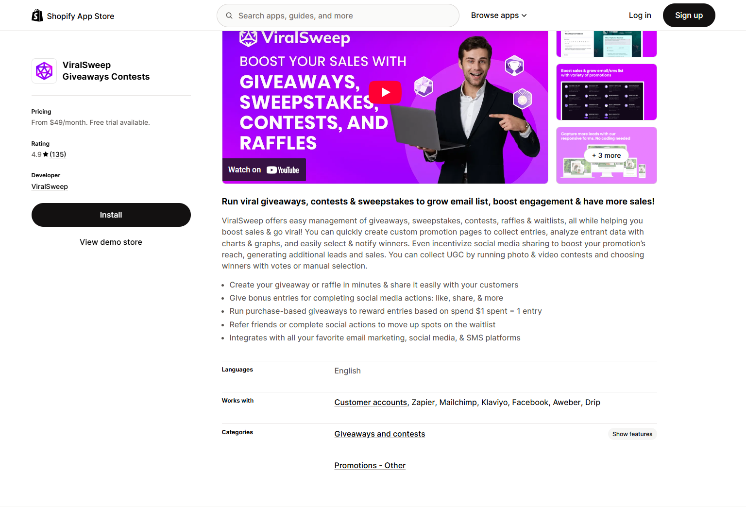 ViralSweep Giveaways Contests | Running diverse campaigns like sweepstakes and raffles | $49/month | No | 4.7/5 |