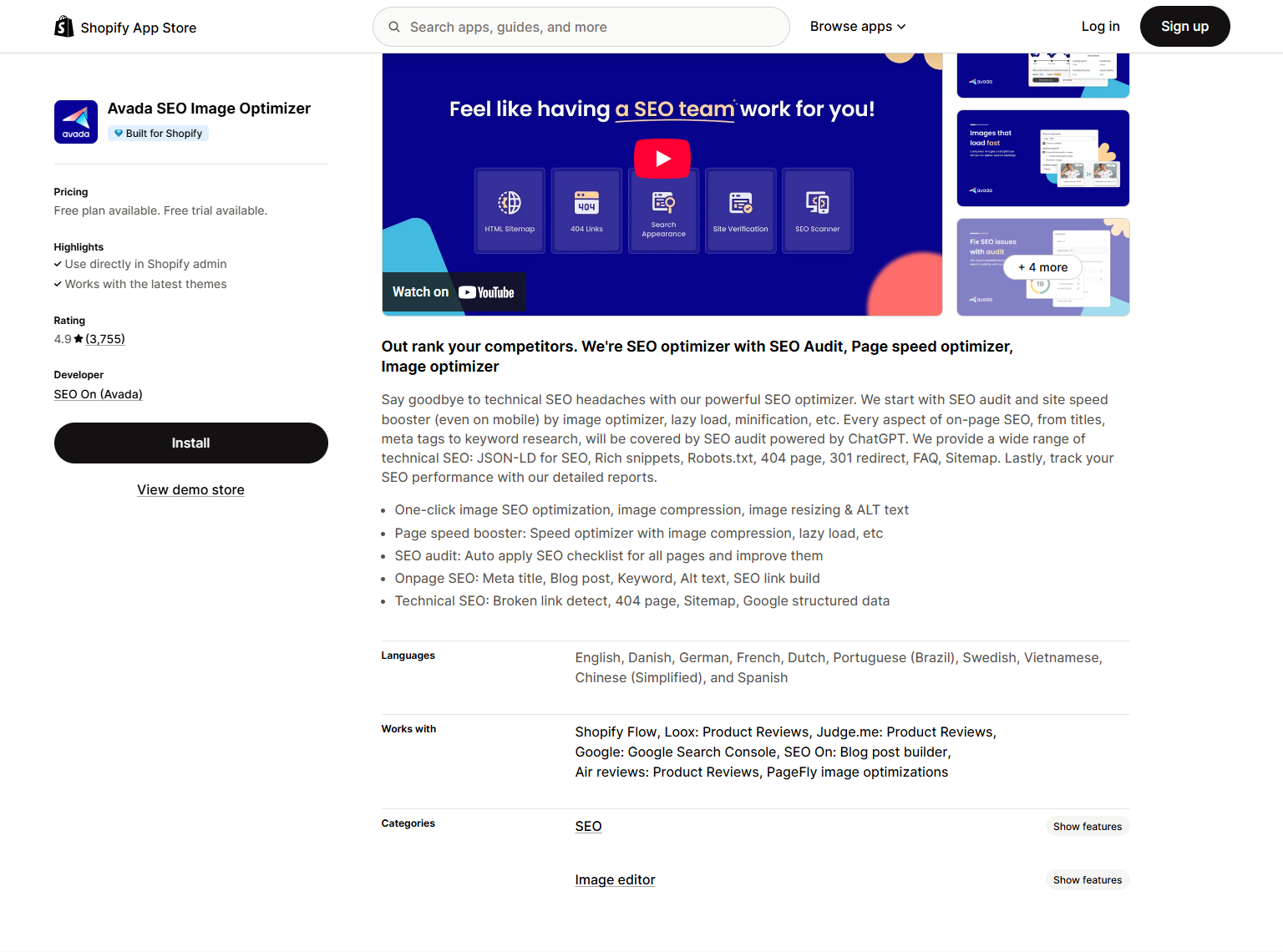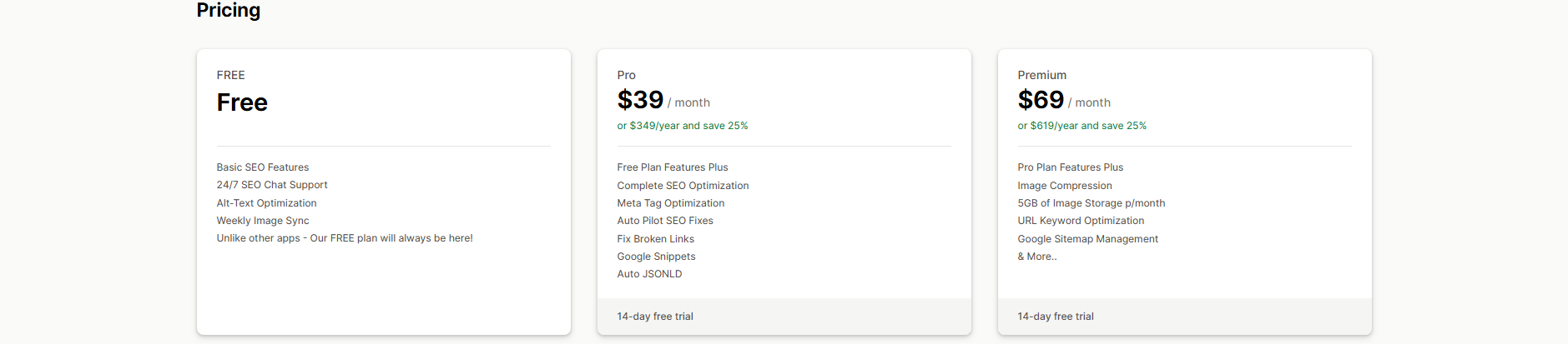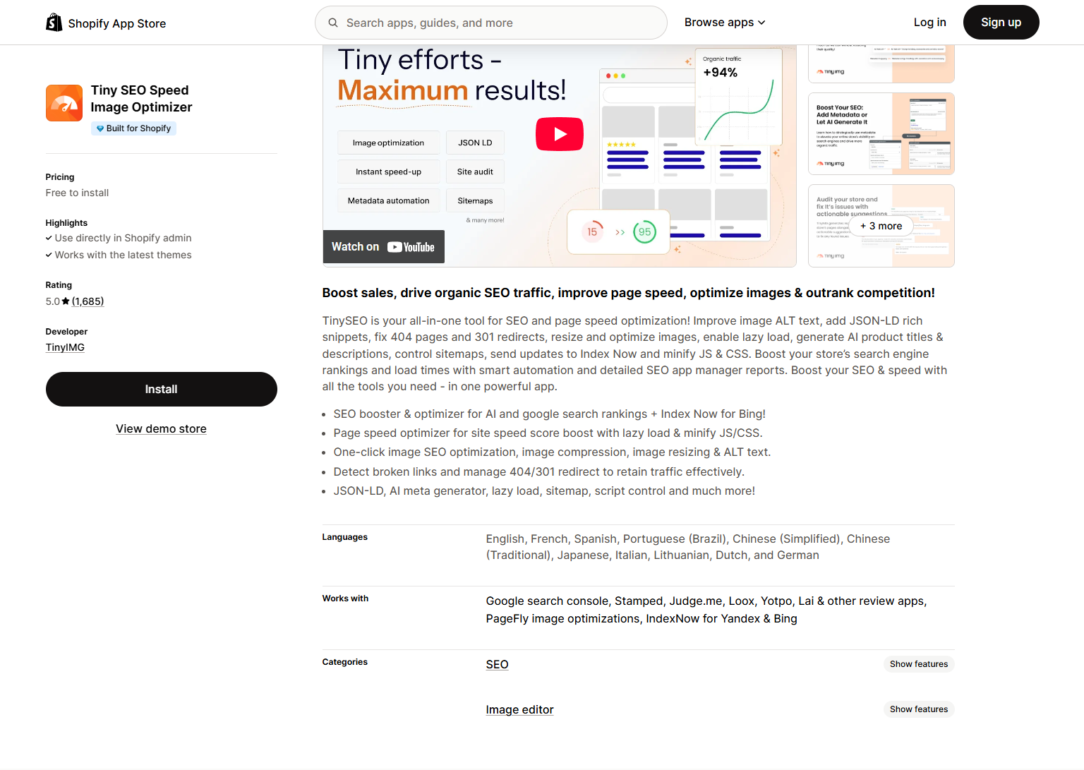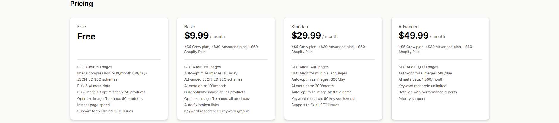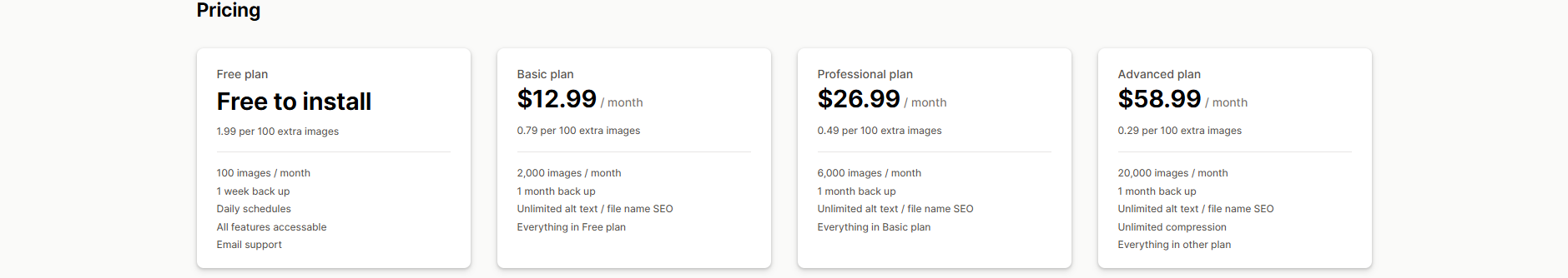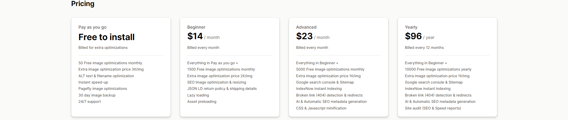 Pricing: Free to install with 50 Free image optimizations monthly. Paid plans are available for $14, $23, and $96 per month.