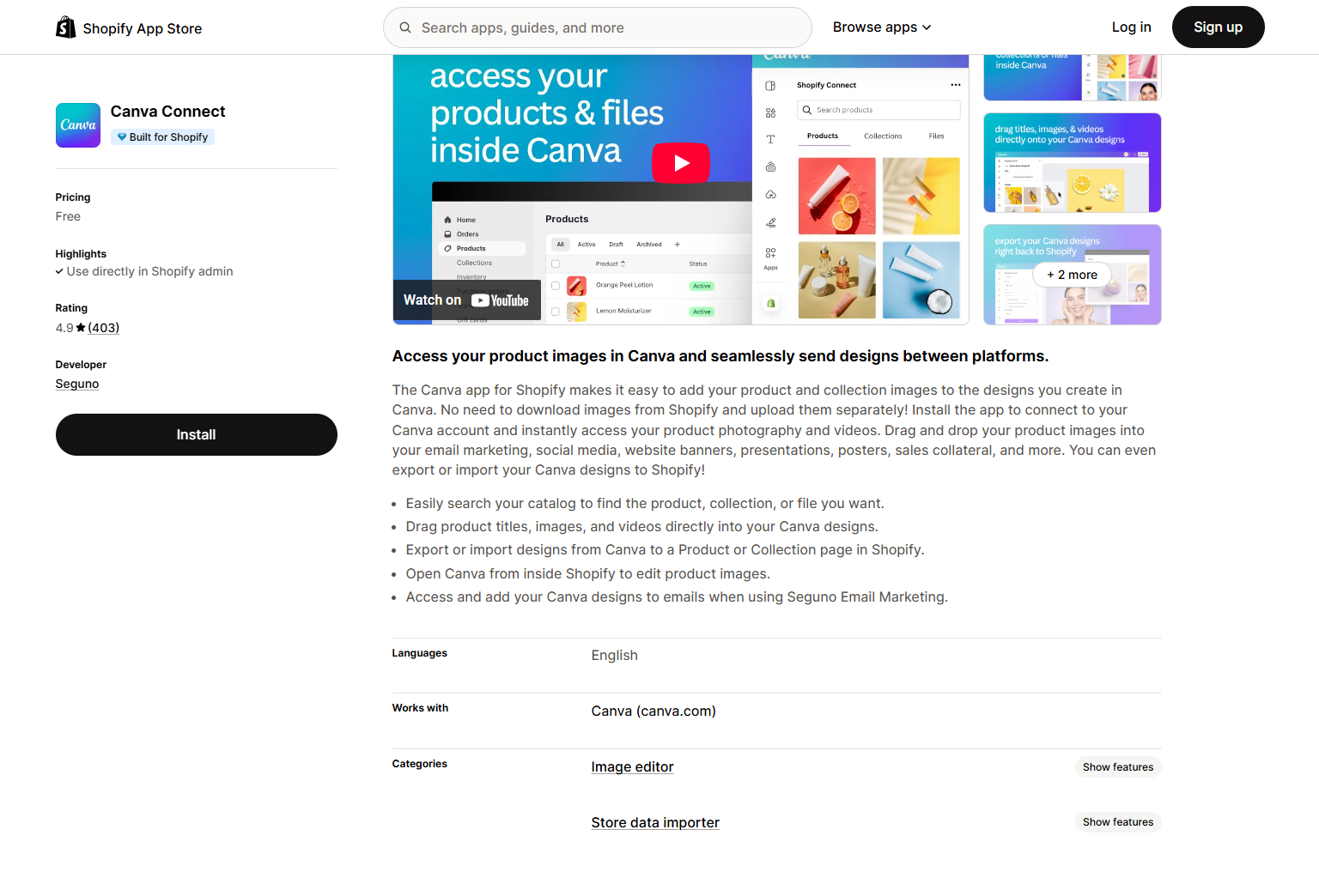 - Access product images and videos directly within Canva.