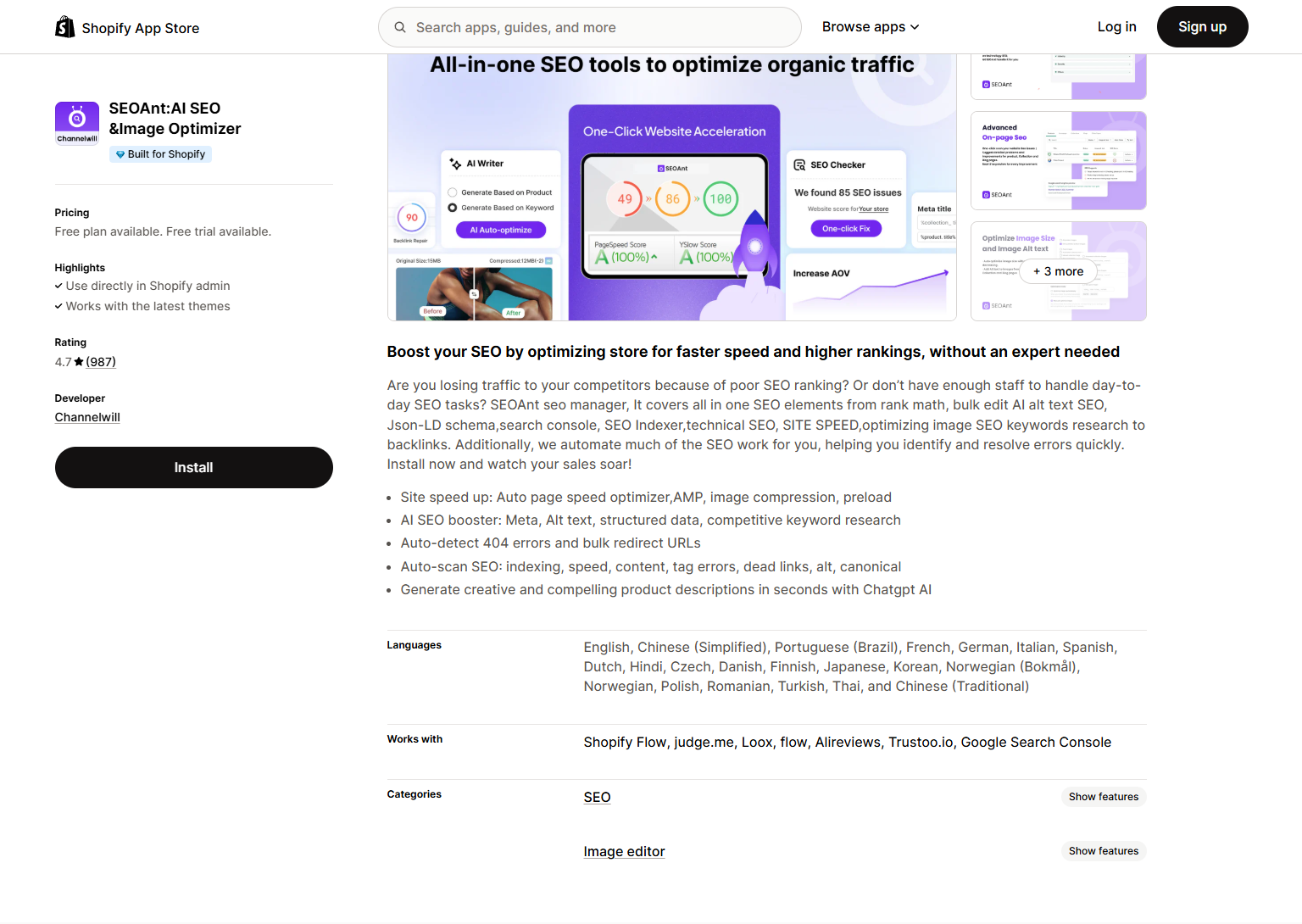 SEOAnt:AI SEO &Image Optimizer | Automated image and on-page SEO optimization | $0 (Free plan available) | Yes | 4.7 |