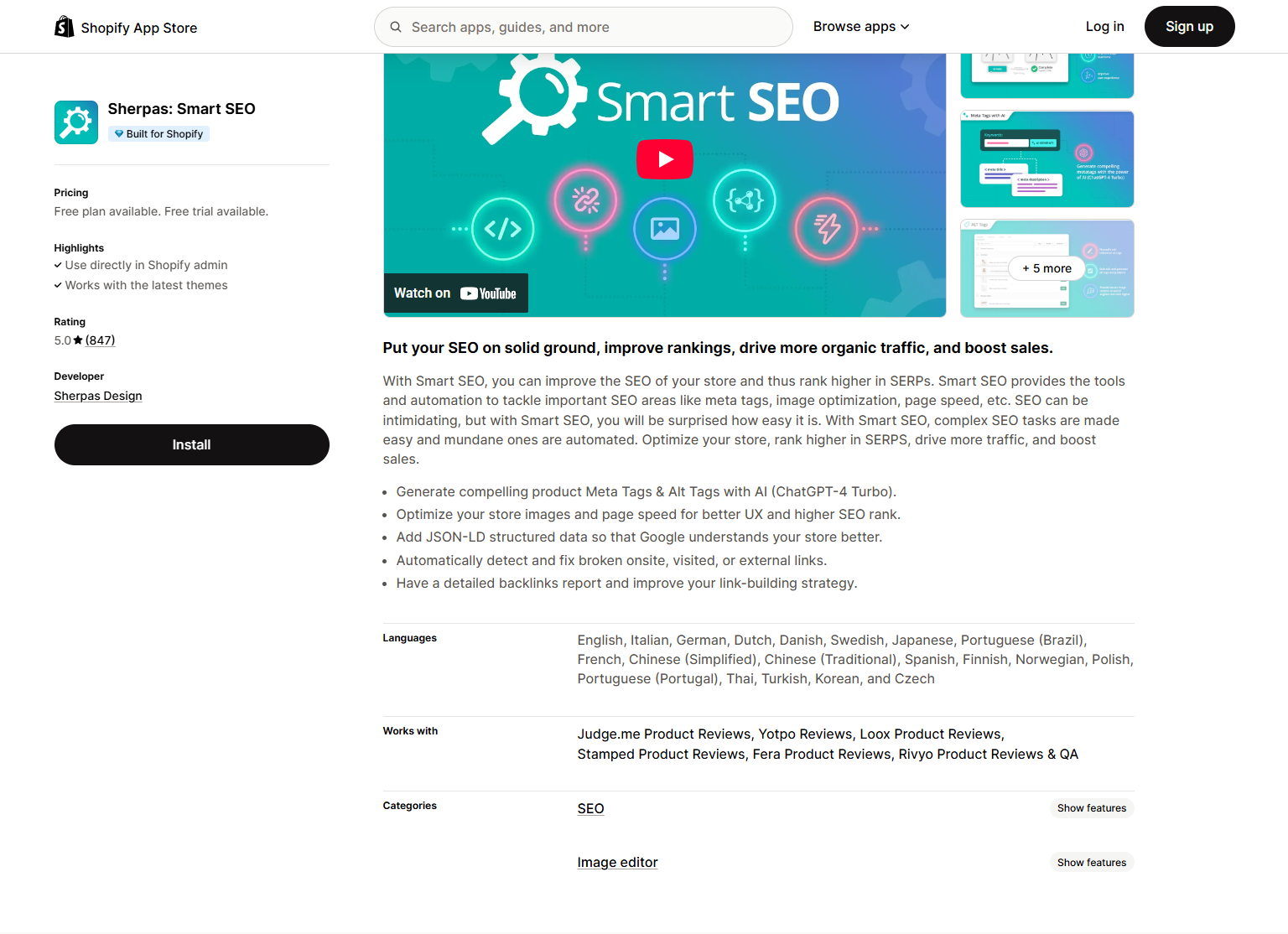 Sherpas: Smart SEO leverages advanced artificial intelligence, including ChatGPT-4 Turbo, to automate and simplify complex SEO tasks. It's ideal for store owners who want to save time while achieving higher rankings.