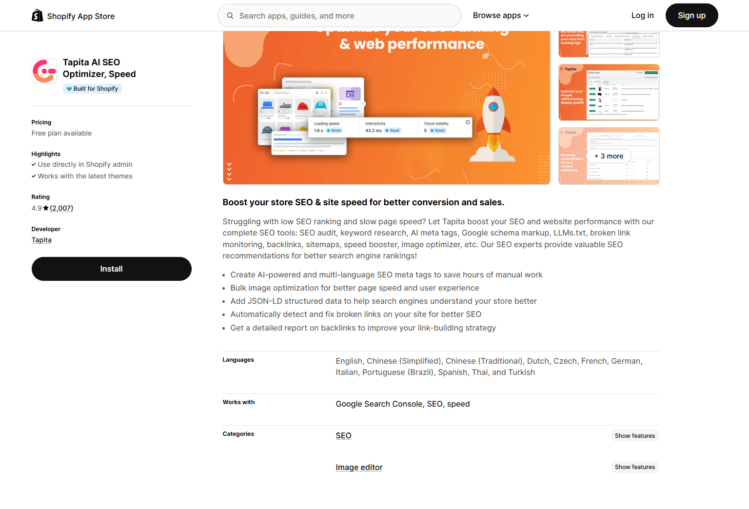 Tapita AI SEO Optimizer, Speed | AI-powered SEO and multilanguage optimization | $0 (Free plan available) | Yes | 4.9 |