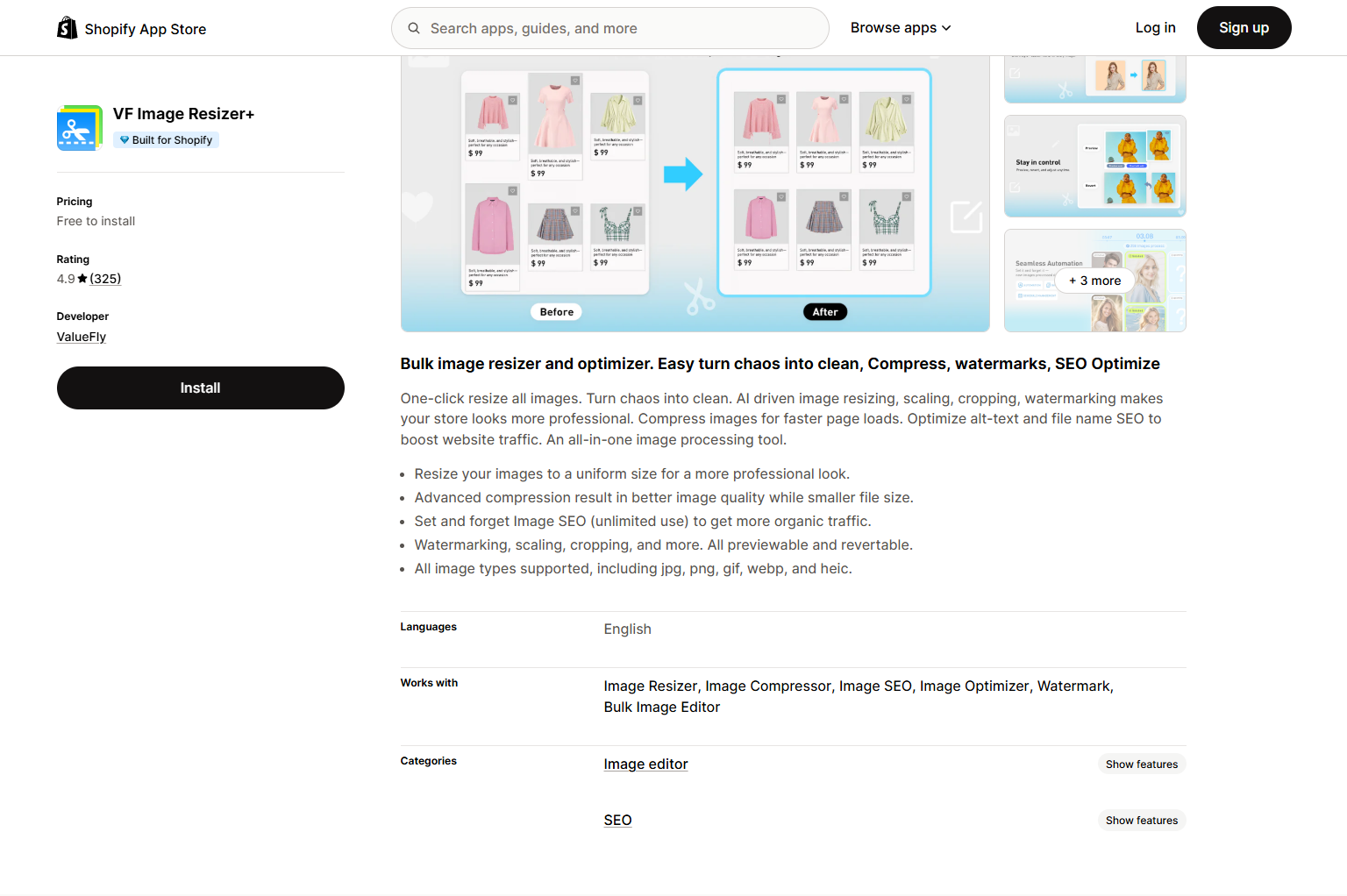 VF Image Resizer+ | Bulk image resizing, watermarking, and SEO | $12.99/month | Yes (Free to install) | 4.9 |