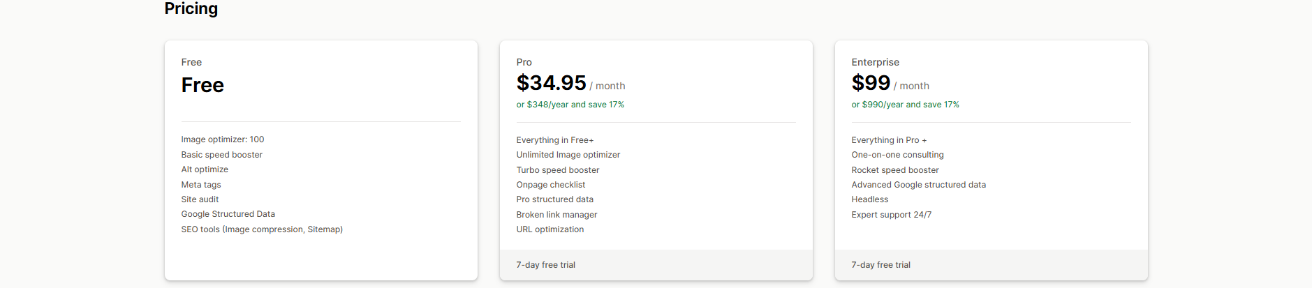 Pricing: A free plan is available for 100 Image optimizer. Paid plans start at $34.95/month, with a 17% discount for yearly billing.